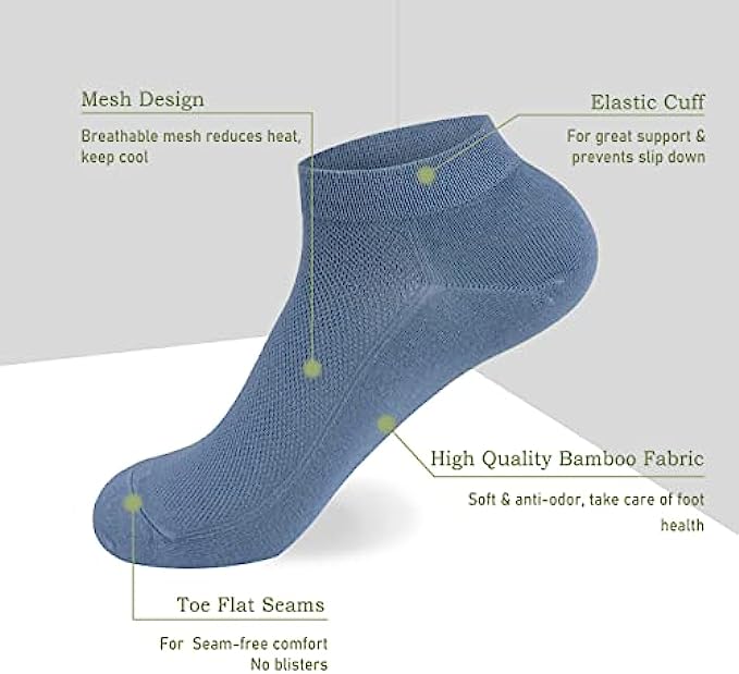 • Bamboo fiber fabric is light and soft, comfortable to wear.Natural plant fiber, adding a force to environmental protection! Breathable mesh ventilation and moisture management keep feet cool and comfortable. The smooth toe seam construction eliminates bulky seams to reduce fraying and prevent blisters.