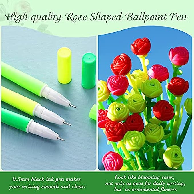 Product information: you will get 60 rose shaped ballpoint pens with 3 different colors, 20 of which are dark green, 20 are light green and 20 are yellow; The quantity is enough to meet your daily use, replacement and decoration needs; These ballpoint pens are not only practical, but also beautiful and interesting
